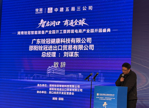 跨境电商产业园开园仪式上, 铨冠健康、邵阳铨冠总经理刘谋东表示铨冠智能跨境产业园聚焦智能小家电与康养产品等核心领域,着力构建研发、制造、跨境运营、国际物流全链条产业体系。园区采用跨境电商加产业链运营模式,为入驻企业提供全流程配套服务。