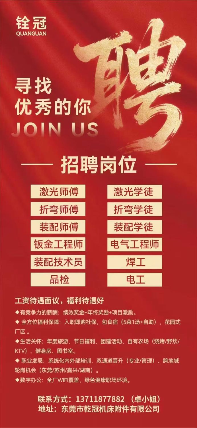 东莞乾冠招聘岗位 招聘岗位:激光师傅、折弯师傅、装配师傅、钣金工程师、电气工程师、焊工、电工、品检等 工作地点:广东东莞虎门