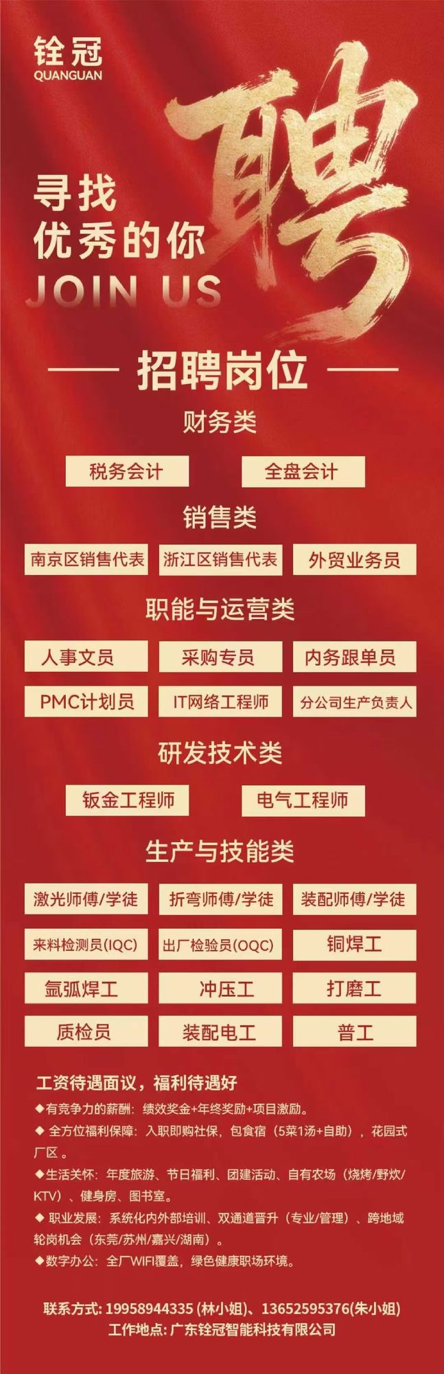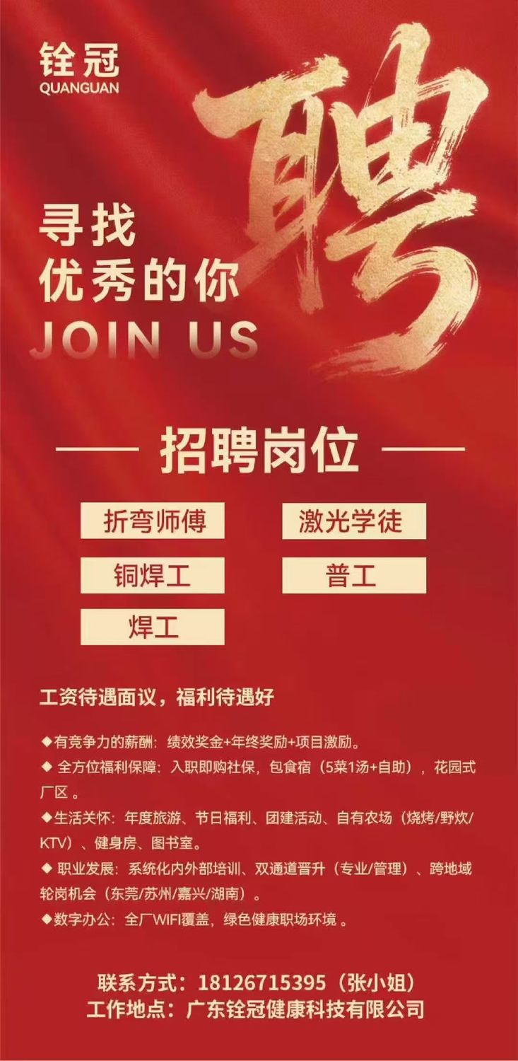 铨冠健康招聘岗位 招聘岗位:折弯师傅、激光学徒、铜焊工、焊工、普工 工作地点:广东东莞虎门